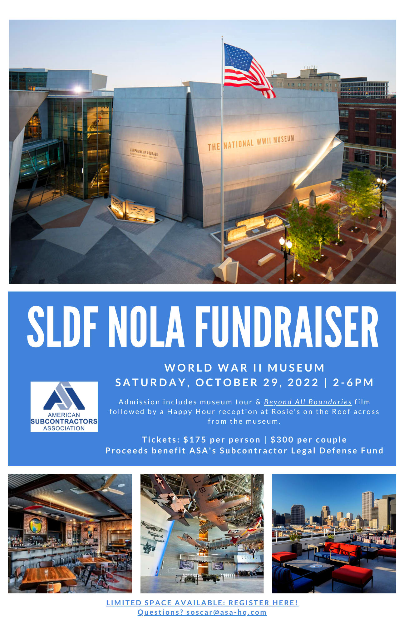 World War II Museum fundraiser. Admission includes museum tour & Beyond All Boundaries film followed by a Happy Hour reception at Rosie's on the Roof across from the museum. Proceeds benefit the Subcontractor Legal Defense Fund.
